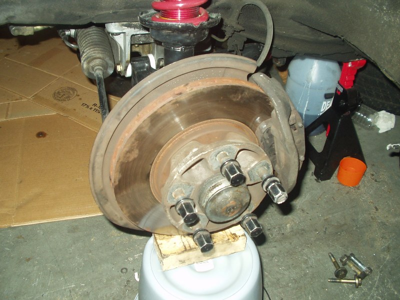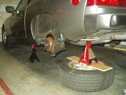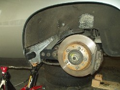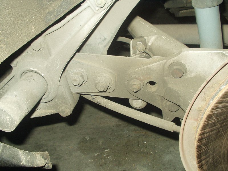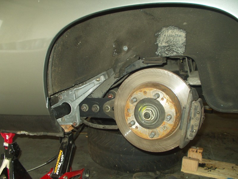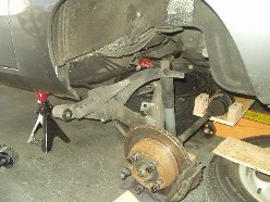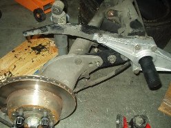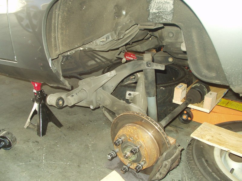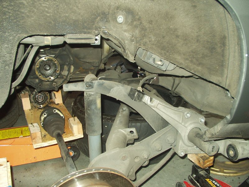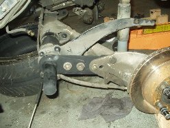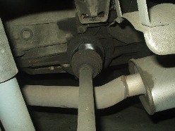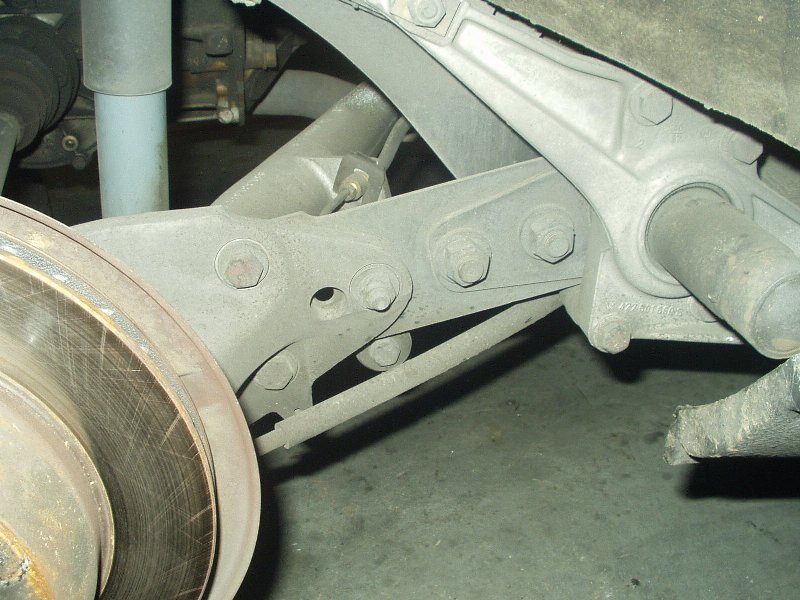 I was without a camera for the indexing of the new bars, but really 4654497461677 pictures of my failed attempts at indexing the bars just right is probably worthless anyway. If you're attempting this, be prepared to spend a lot of time on this step and don't rush it. With both sides measuring the same, I slapped it back together. Getting the torsion tube back into place was probably the worst experience on the whole journey. You really need four jacks and two people to get it done easily. I had three jacks and myself. Once I finally got the beast back into its general home, I once again used the pickle fork to pry it around until the holes were lined up. If you plan on using Welt bushings for the torsion carrier plate, be prepared to drill out the hole to get the bolt to fit. I was lucky enough to find out after I got the entire f-ing torsion tube in place to find out that bolts wouldn't slide through the bushings. A drill, a beer and an hour later, the assembly was bolted back into place.