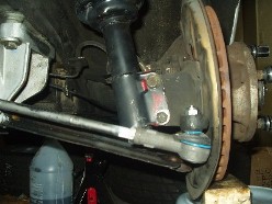 The old tie rods were pretty much busted using my bash 'em 'till they give method of removal. New tie rod ends were cheap, so I didn't sweat it. Here is the front end getting put back together. Next time I'll use a gear puller. Note: the 10" springs in these shots have since been replaced by 7" springs, to achieve proper ride height with room to adjust for corner balancing.