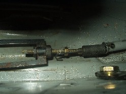 I don't recall at which stage I disconnected the axles and parking brake cable, but I'm pretty sure it was prior to breaking the torsion tube loose. Either way, my pictures are numbered after the loose tube. The parking brake cables can probably be removed at the hubs, but I thought it would be easier to remove the main cable at the parking brake handle. Reinstalling the cable is a little tougher than removing it, but all in all, I would use this method again.